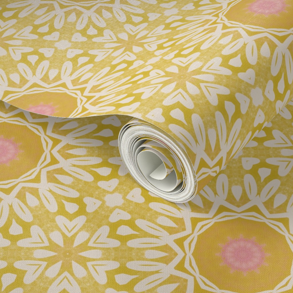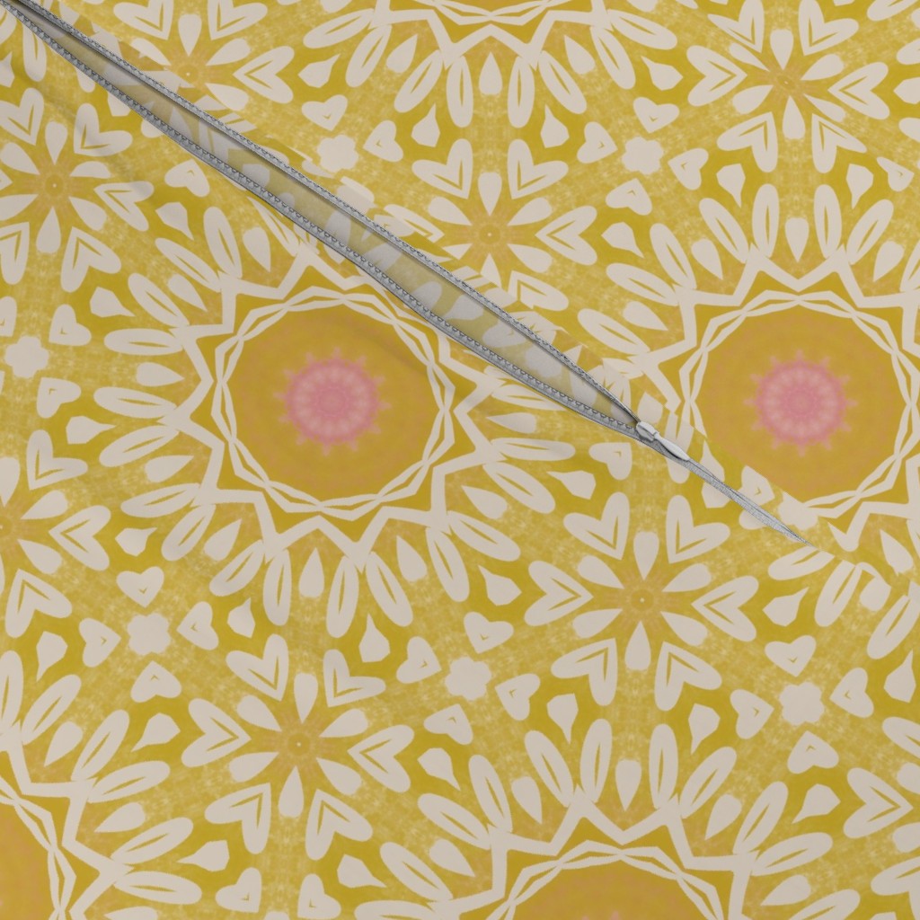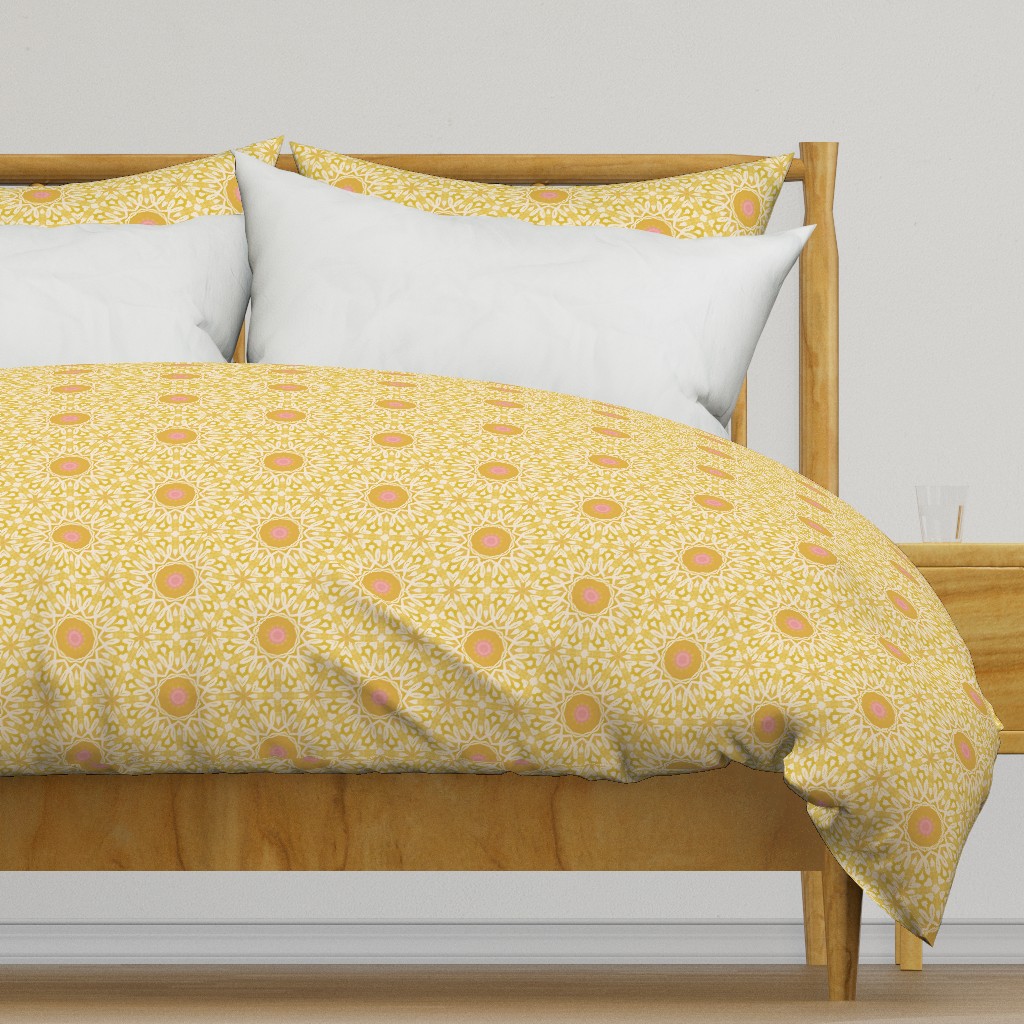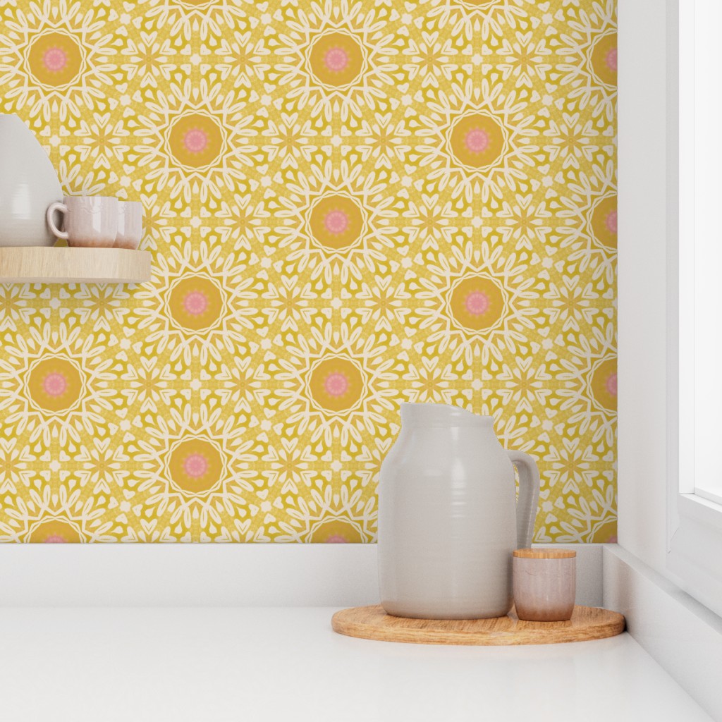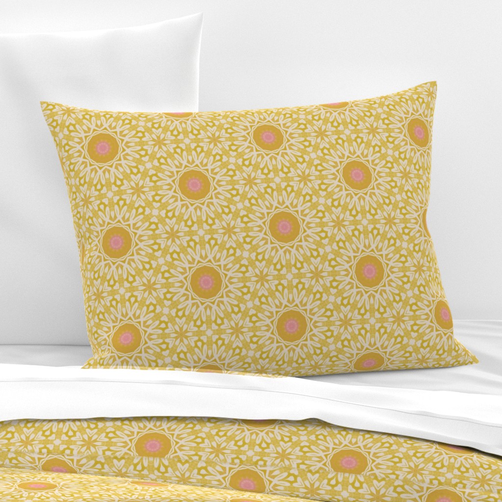 This is a sunny yellow bohemian geometric medallion pattern with beautiful washed yellows, pink centres and intricate white details. Modern, stylish and cheerful. Ideal for brightening a space and adding a touch of joy to it. Whether it is your home office, your bedroom, or else.