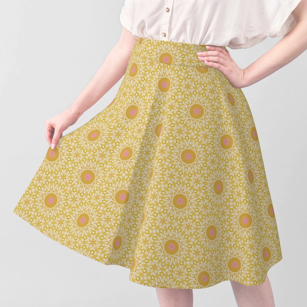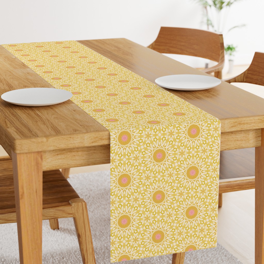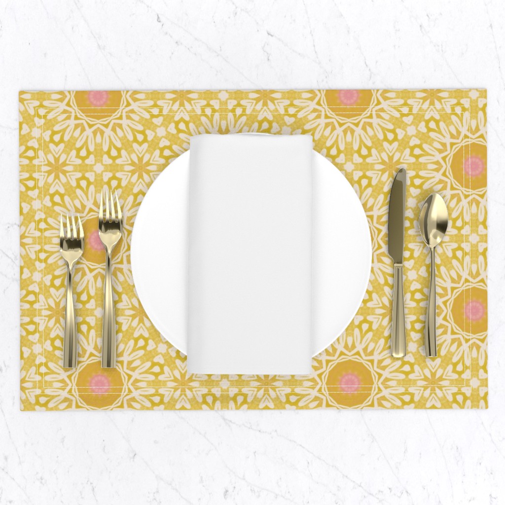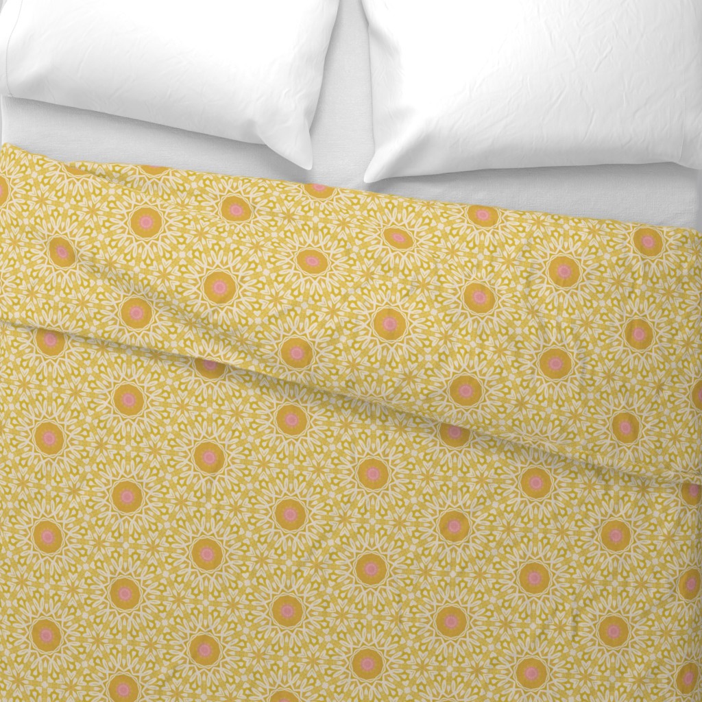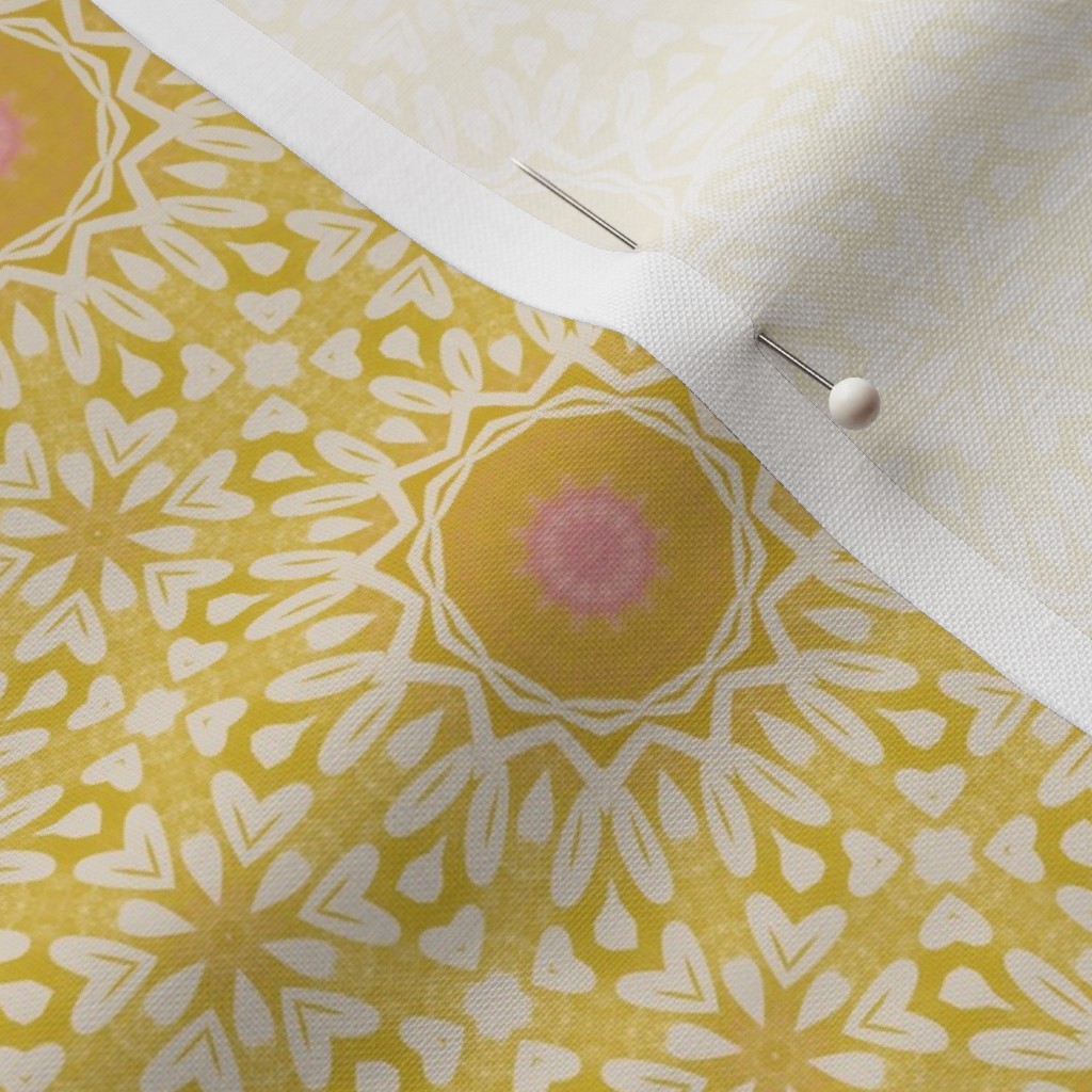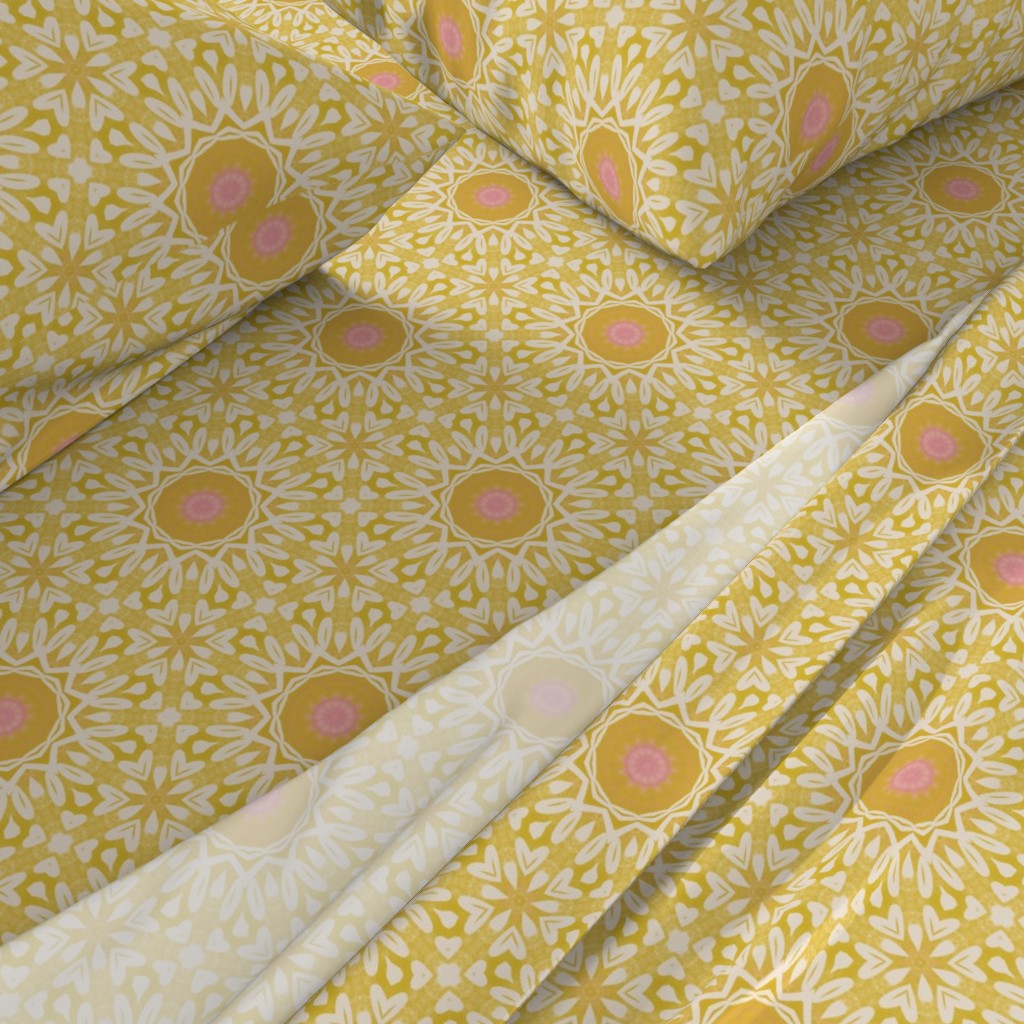 This is a sunny yellow bohemian geometric medallion pattern with beautiful washed yellows, pink centres and intricate white details. Modern, stylish and cheerful. Ideal for brightening a space and adding a touch of joy to it. Whether it is your home office, your bedroom, or else.